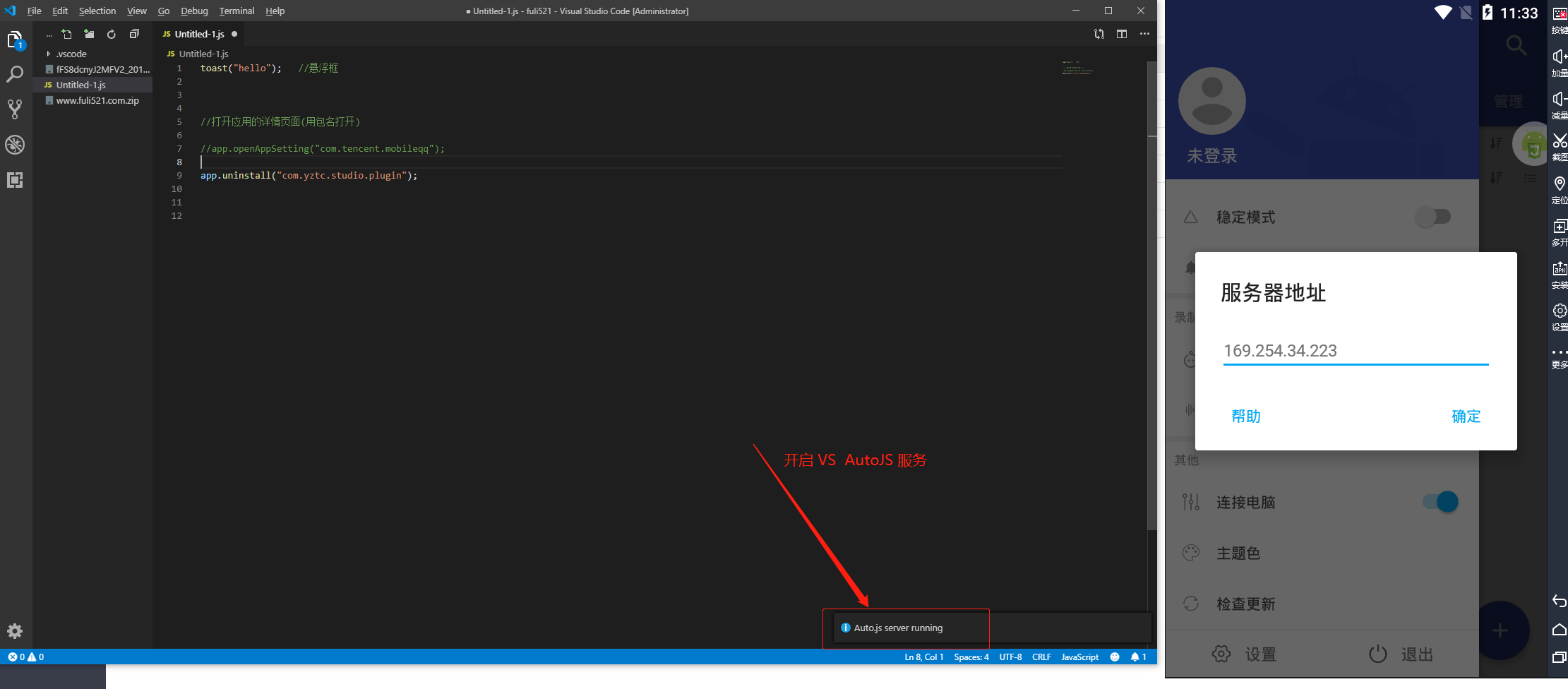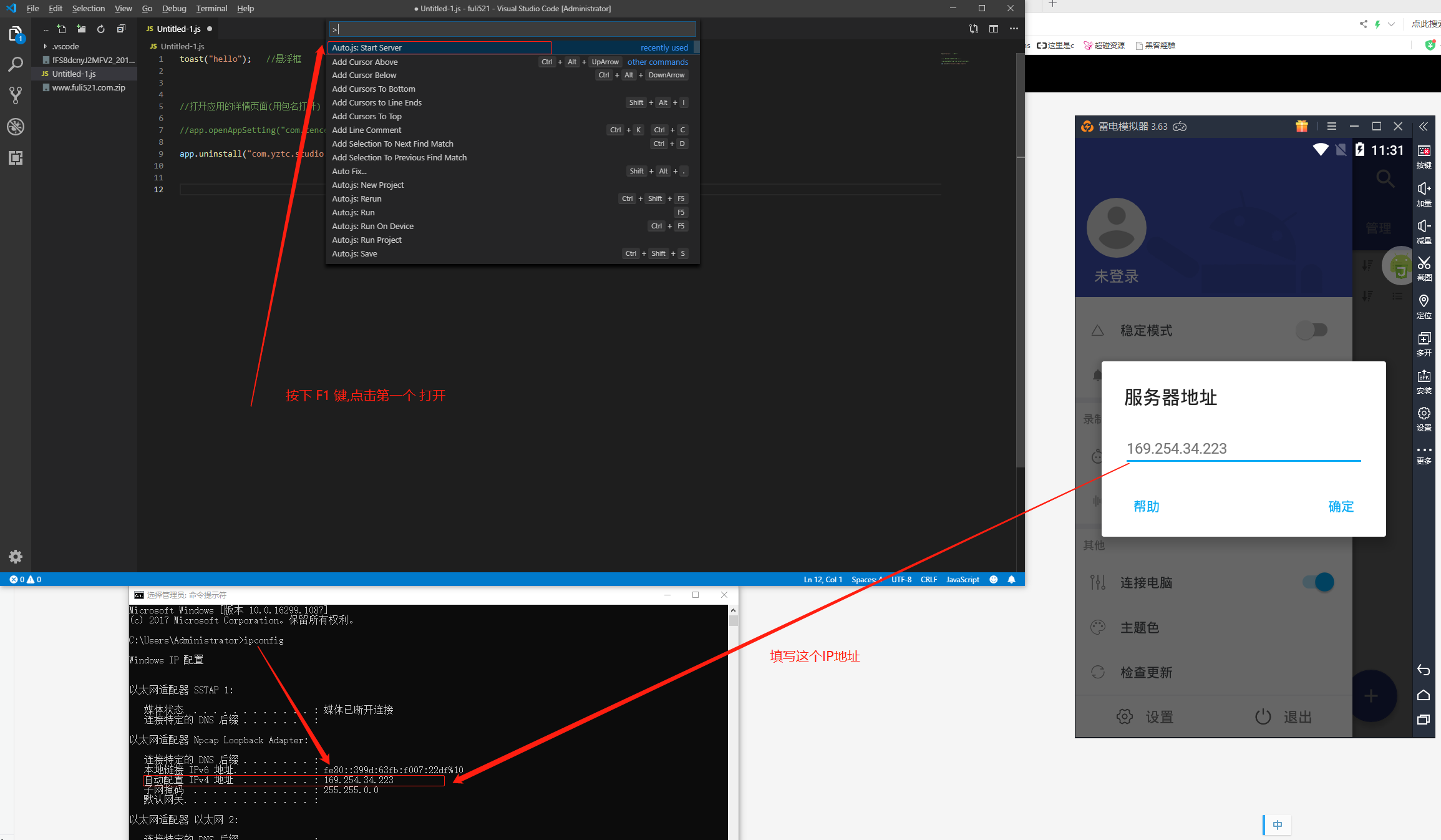 按 F1 启动 AutoJS 服务 , 模拟器 上的 应用填写 IPV4 的 IP 地址.