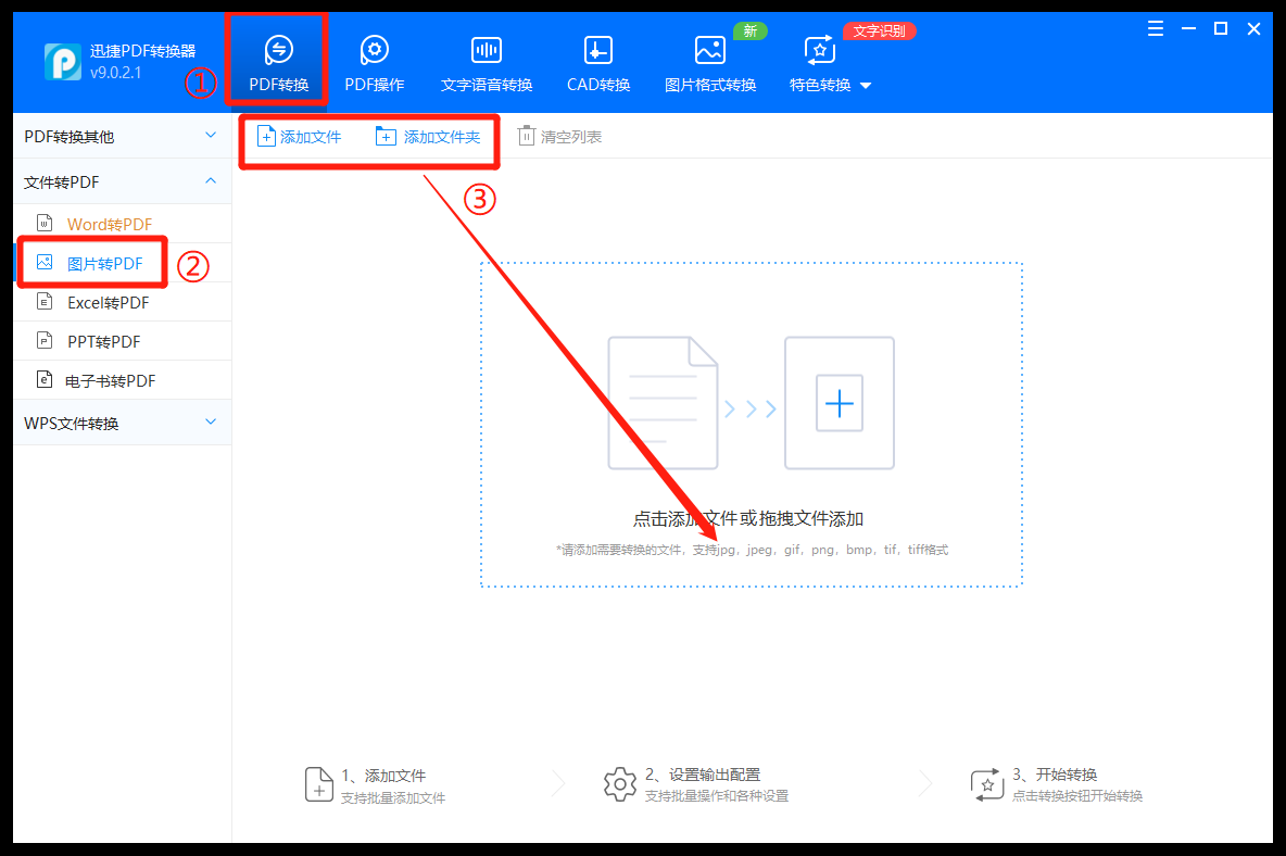 第一步:首先打开PDF转换工具,在首页上方点击点击【PDF转换】功能,在【文件转PDF】中选择【图片转PDF】,然后点击右侧的【添加文件】或者【添加文件夹】将需要转换的图片添加进来。(支持jpg、jpeg、gif、png等格式)