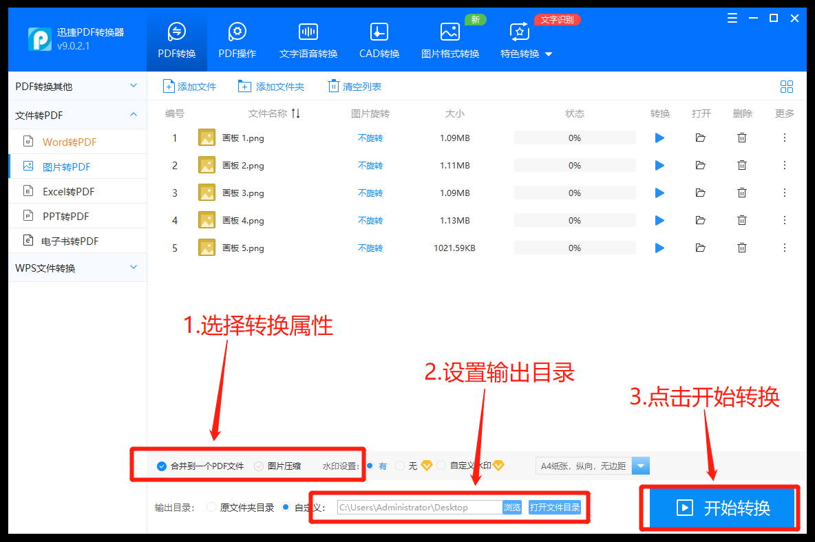 第二步:导入图片后,可以根据转换需求去调整转换属性:【合并到一个PDF文件】、【输出文档名称】、【纸张大小】、【纸张方向】和【页面间距】,设置好属性后点击【开始转换】按钮完成。
