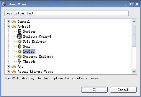 启动Eclipse,在Window->Show View会出来一个对话框,当我们点击Ok按钮时,会在控制台窗口出现LogCat视窗.如下图: