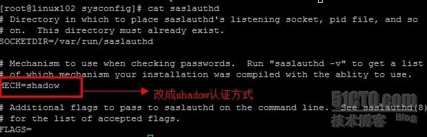 getwent、kerberos5、pam、rimap、shadow和ldap。为简单起见,这里准备采用shadow验证方法,也就是直接用/etc/shadow文件中的用户账户及密码进行验证。因此,在配置文件/etc/sysconfig/saslauthd中,应修改当前系统所采用的密码验证机制为shadow,即: