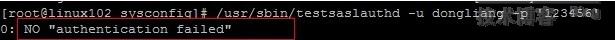 但这里我发现一个问题,当我用/etc/init.d/saslauthd start启动saslauthd的时候,这个时候执行测试认证的命令(上面的命令)会发生如下图所示错误,提示认证失败。