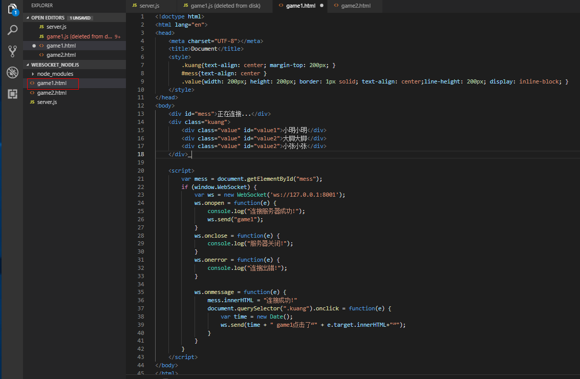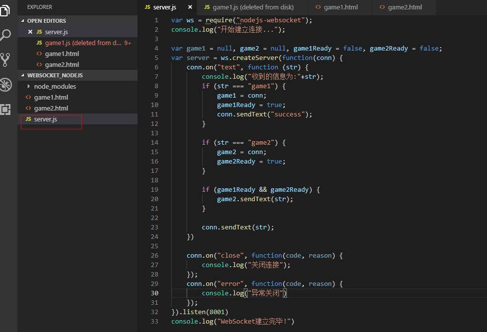 【服务端代码,可以命名为server.js】,根据客户端传来的消息判断哪个是game1,哪个是game2,保存connection对象。
