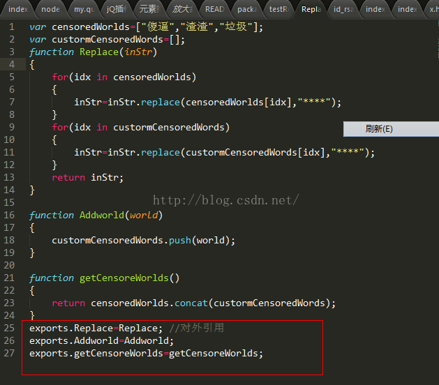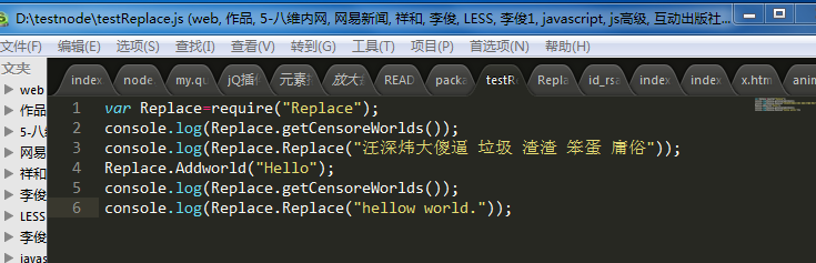 - 在censortext.js下输入一个过滤特定单词并用星号代替的函数。