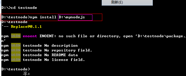 2.用DOS命令到testnode文件夹下,然后安装已经封装好的模块,如果是已经发布到NPM注册表的直接npm install 名字,如果是在本地npm install+tgz文件路径。