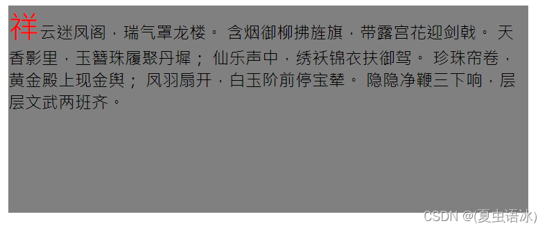 pseudo-element -> :: first-letter 文本首个字符添加样式;