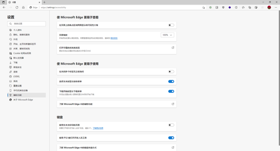 在「使 Microsoft Edge 更易于查看」这个部分中,我们可以调整页面缩放、打开字幕的系统首选项以及在页面焦点区域周围显示高可见性大纲;而「使 Microsoft Edge 更易于使用」这个部分则提供了在关闭多个标签页之前进行询问、选择文本时显示迷你菜单、下载开始时显示下载菜单等选项。