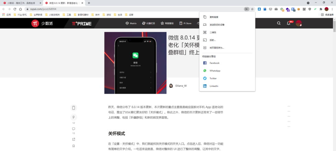 和当前的 Android 版 Chrome 类似,新版共享中心可以快速就当前浏览的页面进行链接复制、生成二维码、投射或者保存等操作,同时还提供了部分社交媒体入口方便快速分享。当然有一说一,比起 Edge 的分享功能,Chrome 共享中心支持的跳转目标还是少了点。