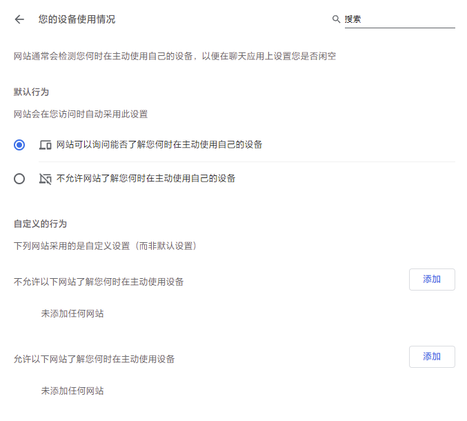 简单来说,通过这个 API 浏览器可以判断用户当前是否有浏览动作,并通过 API 接口向开发者提供这一状态信息,因此也很有可能被滥用。这一 API 在 Chrome 94 稳定版中默认启用,如果你对这一数据较为敏感,不妨在网站权限控制中对「您的设备使用情况」一项勤加检查。