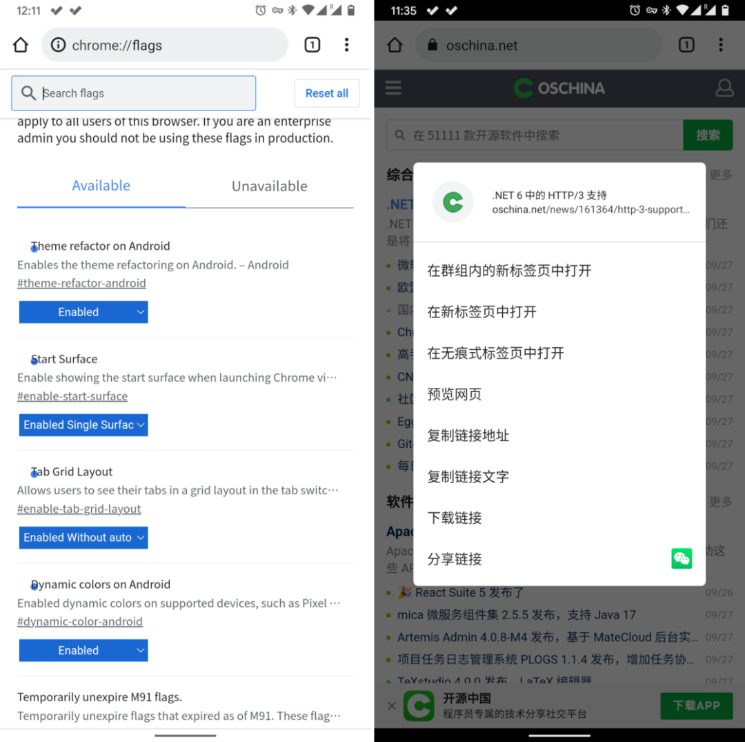 地址栏背景、选词高亮背景、标签页预览卡片边框、设置菜单……Chrome 94 中不少浏览器组件都会从 Android 12 的壁纸中提取色彩,让浏览器与系统之间的观感体验更加和谐一致。不过这些新变化在 Chrome 94 也并非是直接开启的,依旧需要通过手动启用Dynamic colors on Android和Theme refactor on Android两项功能标签来手动开启。