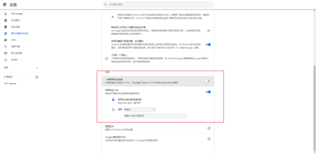 对网络安全有较高要求的朋友不妨在「设置 > 隐私设置和安全性 > 高级 > 一律使用安全链接」中开启试试;不过当前的国内互联网环境下,严格的 HTTPS 规则偶尔也会在浏览时造成困扰吧。