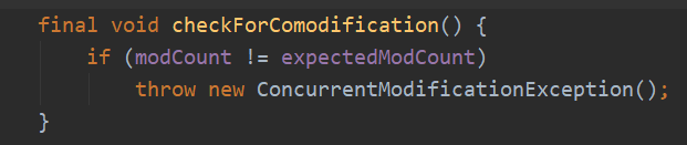 可以看到第一行就是这个checkForComodification()方法,我们点进去看一下: