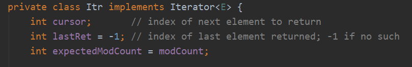 (3)expectedModCount --修改次数的期望值,可以看到在迭代器初始化时,这个属性就被赋值为当前修改次数的值了。