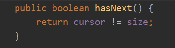 在迭代过程中,每一次迭代cursor都会+1,而itr.hasNext()会判断是否存在下一个元素、irt.next()获取下一个元素的值,最终直到不存在下一个元素,则迭代结束。跟进源码发现,itr.hasNext()判断方法并不会调用checkForComodification方法来检查list在迭代中是否有被修改,只是判断游标和长度是否相等,不等时则认为存在下一个元素,只有在调用next()方法才会尝试抛出checkForComodification异常: