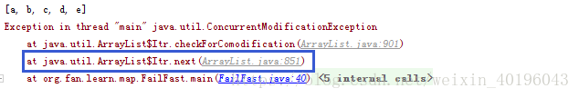 从抛异常的报告上对应的代码是if(iterator.next().equals("c")) { 这一行。从调用栈来看,是在java.util.ArrayList的内部类Itr的next方法在调用checkForComodification方法时抛的异常。
