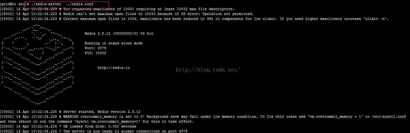 2、第二种指定配置文件 执行命令 :[grid@h1 src]$ ./redis-server ../redis.conf