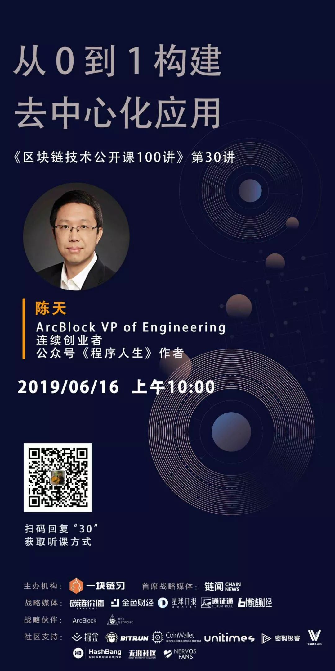 2019 年 6 月 16 日 上午 10 点,ArcBlock 区块基石研发副总裁陈天将出席“一块链习”主办的第 30 期《区块链技术公开课 100 讲》,探讨分享今天在公链和应用链上开发 DApps 的各自优劣,以及如何使用 ArcBlock Forge 框架及其工具从零到一构建、测试以及部署 DApps。