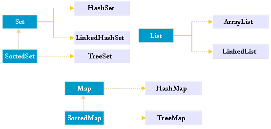 Set、List、Map都是接口类,定义的是规范,具体使用时,还是需要其实现类的实例。一般我们见得比较多的就是HashSet、TreeSet、ArrayList、LinkedList、HashMap等,另外还有Vector、HashTable什么的,这个涉及了多线程中的线程安全以及性能问题,现在出场率比较低了。