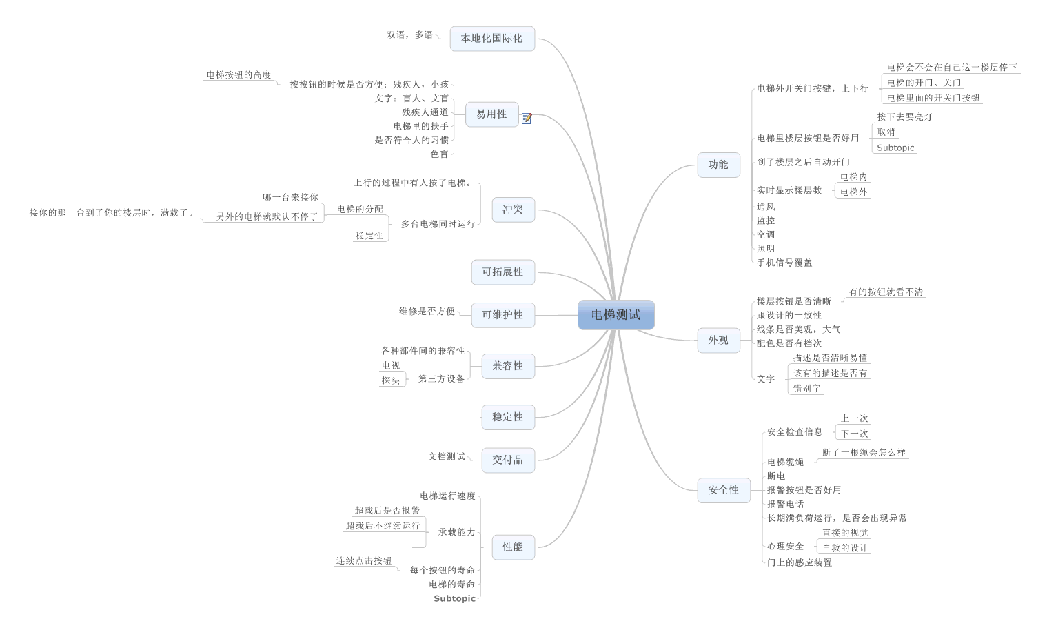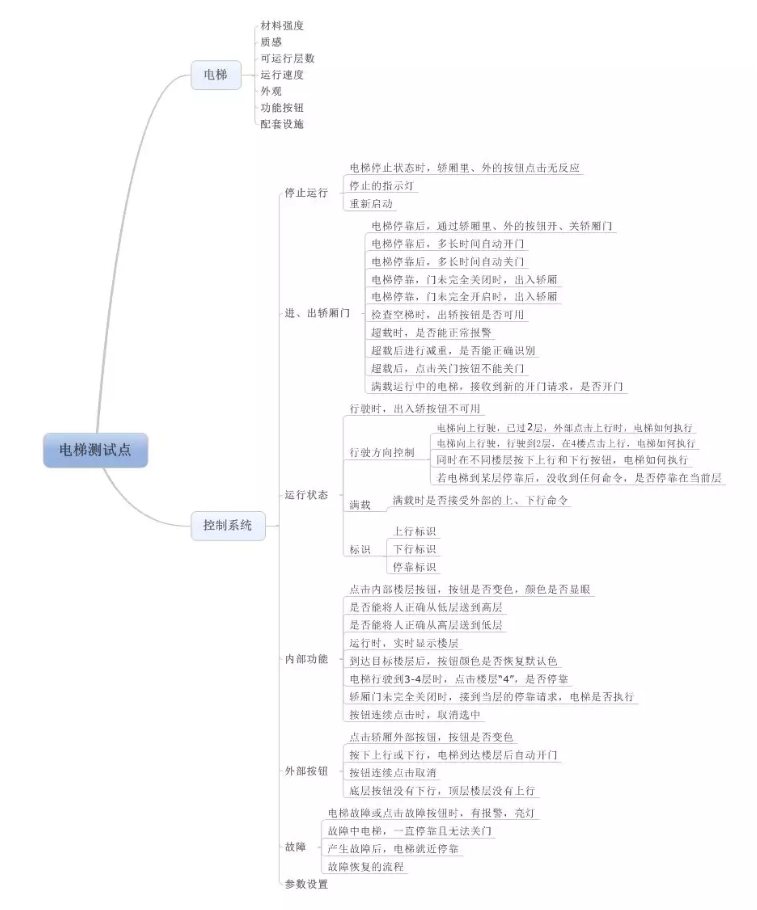 第二张图按照电梯和电梯控制系统进行了划分,然后重点写了写控制系统的测试点,给出的这种分类方式可以借鉴一下,按照这样的分类,可以让笔者在思考测试点时更有条理。