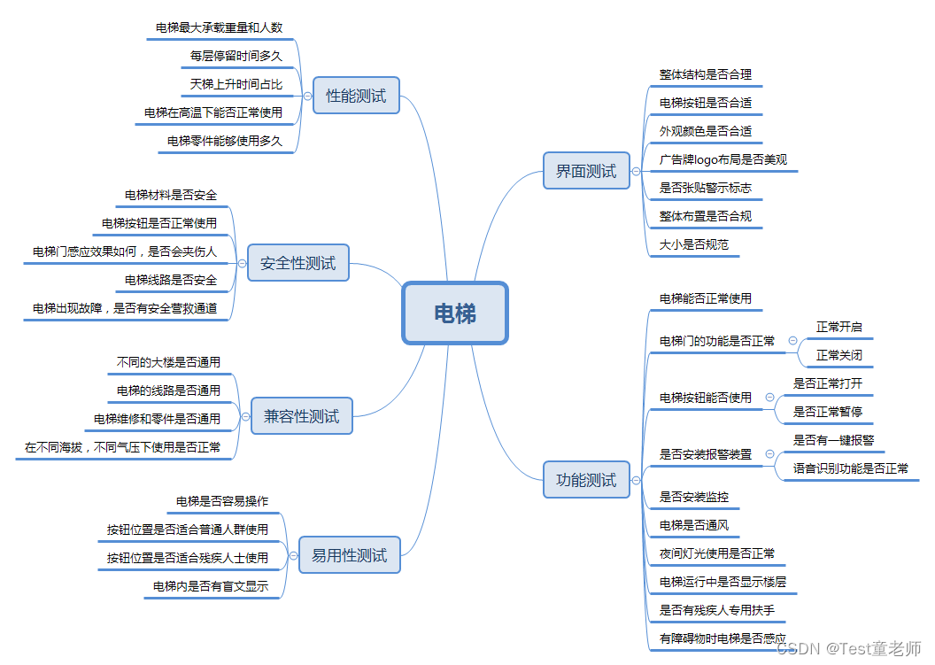 下面是以电梯的测试,从六个方面给大家画了一个思维导图,仅供参考,你们想的可能更加全面一点;
