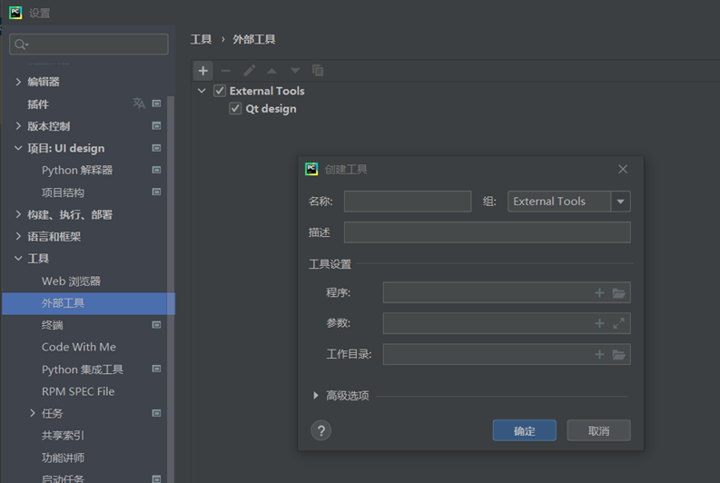 2.名称就叫Qt design吧;描述任意;参数可不填;工作目录点击“+”后选择"FileDir-工作目录";程序需要找到designer.exe(必须得安装了pyqt5-tools才有此可执行文件),该exe文件一般在