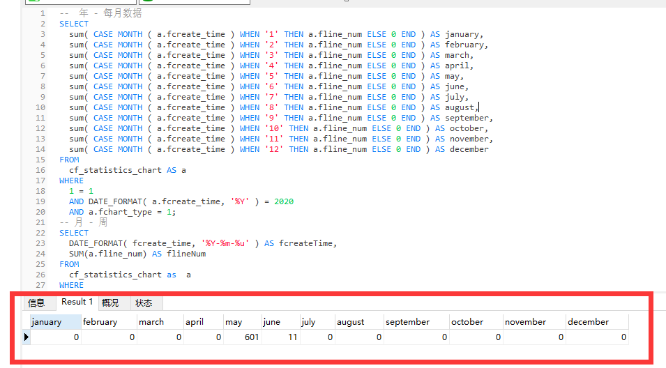 sum( CASE MONTH ( a.fcreate_time ) WHEN '1' THEN a.fline_num ELSE 0 END ) AS january,