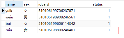 insert into info_copy(name,sex,idcard) values('ruiu','女','510106198809246461');