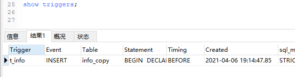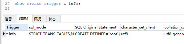 2.查看某个触发器的定义:show create trigger t_info;