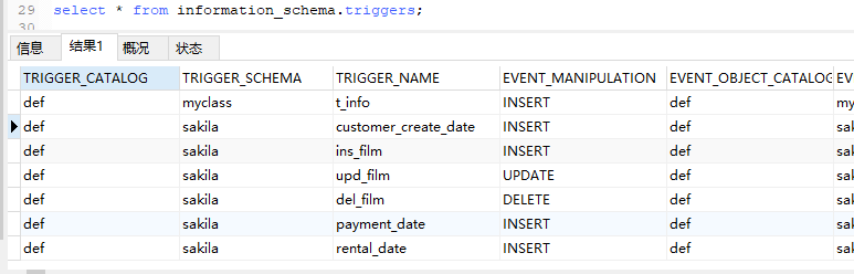 1.查看当前数据库中所有触发器的信息:show triggers;