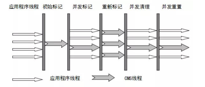 CMS(Concurrent Mark Sweep)收集器是一种以获取最短回收停顿时间为目标的收集器。它非常符合在注重用户体 验的应用上使用,它是HotSpot虚拟机第一款真正意义上的并发收集器,它第一次实现了让垃圾收集线程与用户线程 (基本上)同时工作。 从名字中的Mark Sweep这两个词可以看出,CMS收集器是一种 “标记-清除”算法实现的,它的运作过程相比于前面 几种垃圾收集器来说更加复杂一些。整个过程分为四个步骤: