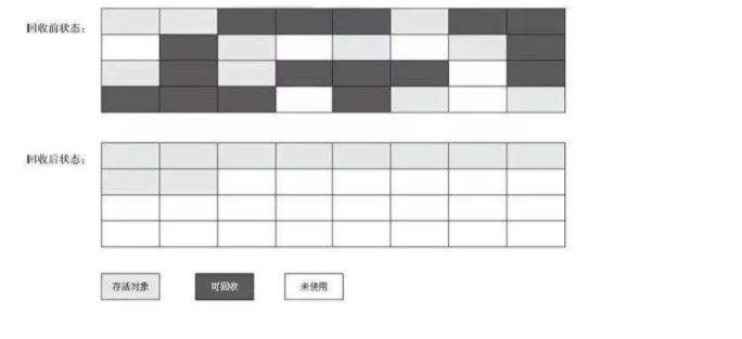 根据老年代的特点特出的一种标记算法,标记过程仍然与“标记-清除”算法一样,但后续步骤不是直接对可回收对象回收,而是让所有存活的对象向一端移动,然后直接清理掉端边界以外的内存。