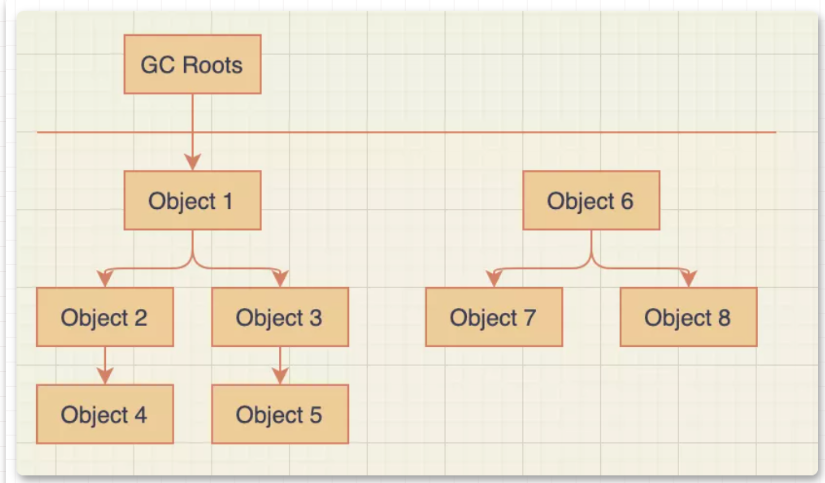 (2)根可达算法:这也是「「JVM 默认使用」」的寻找垃圾算法,它的原理就是定义了一系列的根,我们把它称为 「「"GC Roots"」」 ,从 「「"GC Roots"」」 开始往下进行搜索,走过的路径我们把它称为 「「"引用链"」」 ,当一个对象到 「「"GC Roots"」」 之间没有任何引用链相连时,那么这个对象就可以被当做垃圾回收了