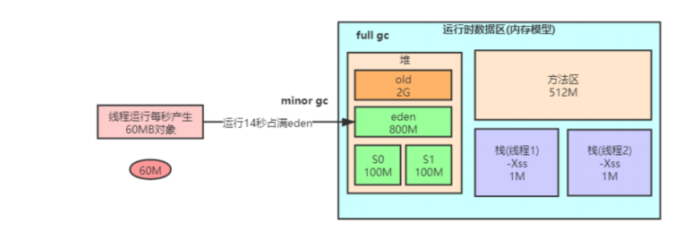 线程每秒产生60m的对象,每过14s,新生代的eden就会被占满,此时出发minor gc,60m>Survivor的一半,此时60m的对象就会被放入老年区,老年区会被慢慢的沾满,导致full gc;