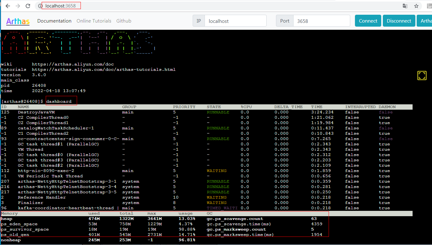 一.官网下载Arthas的完整发布包arthas-bin.zip(本质就是一个SpringBoot工程),使用java -jar arthas-boot.jar启动,选择需要监控的工程进程就可以进行监控了: