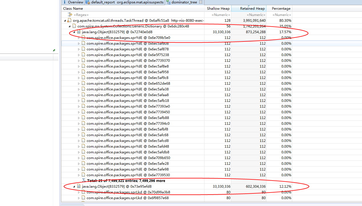 怎么理解Shallow Heap和Retained Heap呢?Shallow Heap这个实际是线程或方法自身的占用大小,例如一个线程本身内部就有线程空间,虽然很小但是也是存在的,在上图中该线程Shallow Heap就是128个字节。而每一个sprYdE自身Shallow Heap就是112个字节。但是为什么Retained Heap会这么大呢?那是因为线程内部有很多其它的对象或属性等,对象本身又指向一个内存大小,因此把这些全部加起来就是总的占用内存大小了。从上图可以看到这个线程的Retained Heap是非常大的,原因是创建了大量的sprYdE对象和sprLkd对象积累导致的。