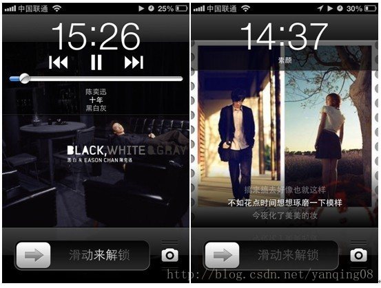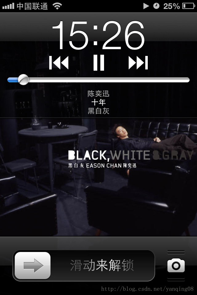 上图是当前iphone播放歌曲的锁屏界面,ios系统在锁屏界面提供显示的信息目前只有4个:播放歌曲名字(十年)、演唱者(陈奕迅)、歌曲所属专辑(黑白灰)和专辑图片,而且在锁屏环境下,应用程序在后台运行的时候,程序的能力范围十分有限,系统也没有提供在锁屏界面下可以显示歌词的api接口,目前市面上的音乐播放器也都只能做到这一步。
