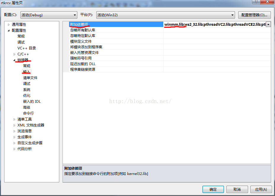 1)打开VS2010 项目属性设置中添加相应的库 F方法为:项目->属性->链接器->输入->附加依赖项 中加入相应的库winmm.lib,用分号(;)与其他的库分开,