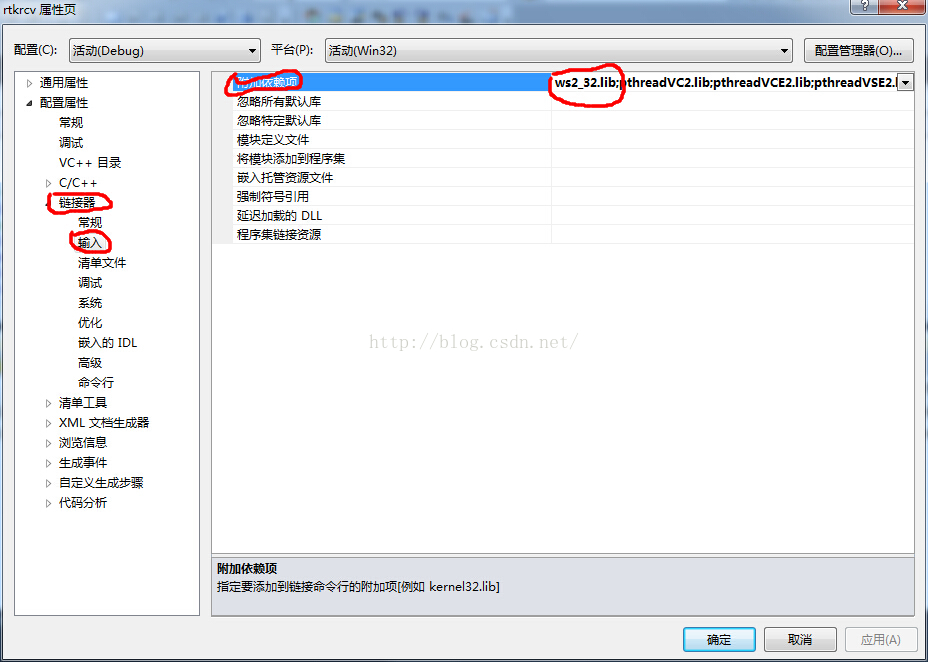 1)打开VS2010 项目属性设置中添加相应的库 F方法为: 项目->属性->链接器->输入->附加依赖项 中加入相应的库 ws2_32.lib,用分号(;)与其他的库分开,