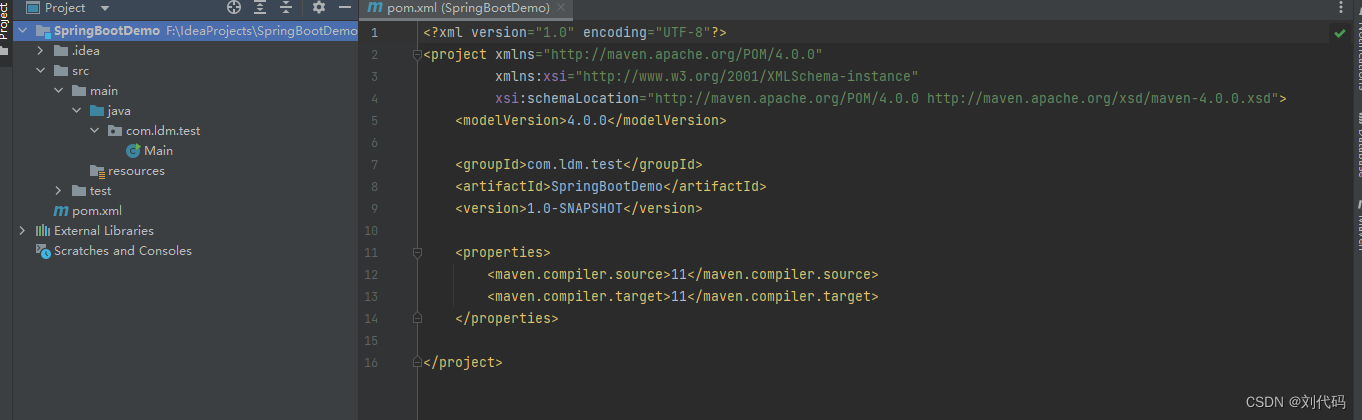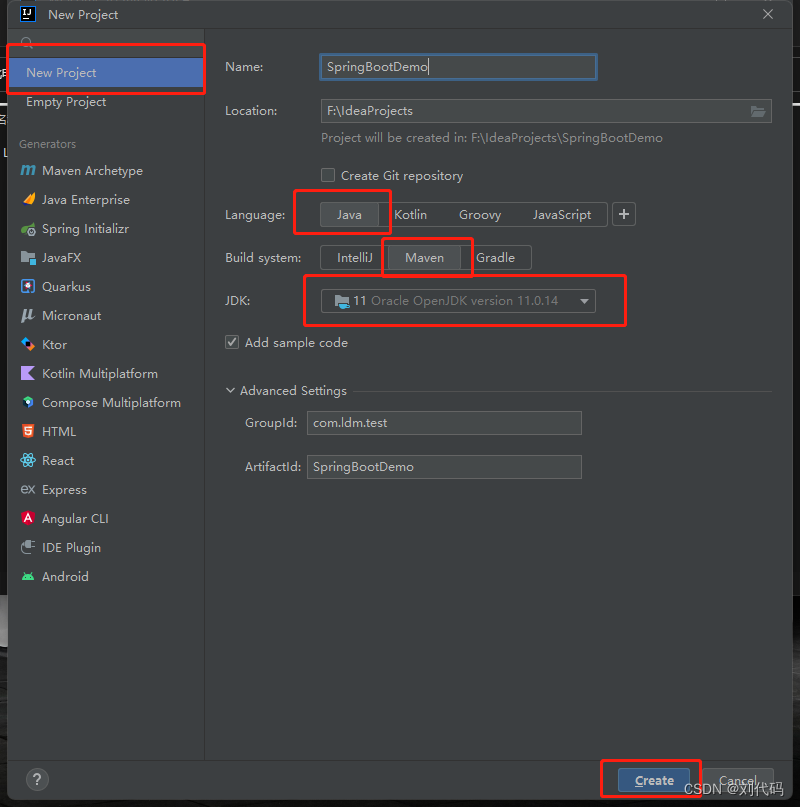 然后在弹出的下图窗口中,选择左侧菜单的【New Project】(注:和2022之前的idea版本不同,这里左侧没有【Maven】选项,不要选【Maven Archetype】!!!),输入Name(项目名):SpringBootDemo,language选择【java】,build system选择【maven】,然后选择jdk,我这里选的是jdk11,GroupId要遵循包名的命名规范,而ArtifactId可以认为是项目名