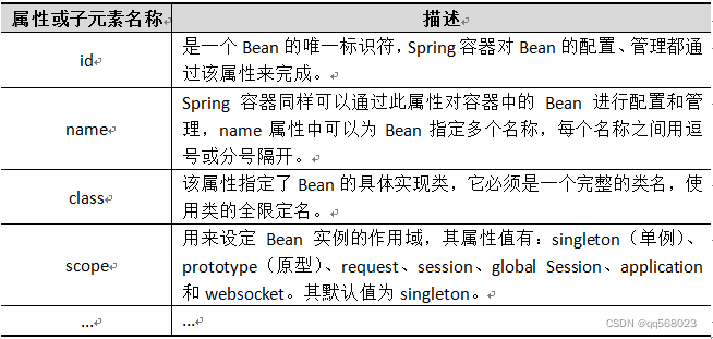 XML配置文件的根元素是<beans>,<beans>中包含了多个<bean>子元素,每一个<bean>子元素定义了一个Bean