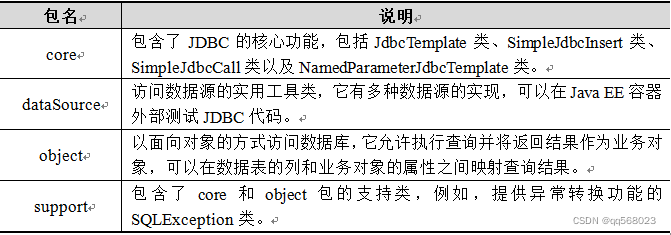 Spring JDBC模块主要由4个包组成,分别是core(核心包)、dataSource(数据源包)、object(对象包)和support(支持包)