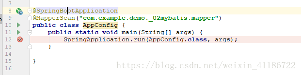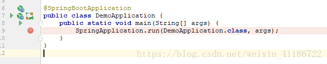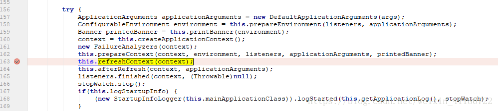 该配置类上贴上了SpringBootApplication注解,在运行方法上打上一个断点,我们通过debug来观察程序运行的流程,最终可以发现他的核心是在SpringApplication类的第163行,