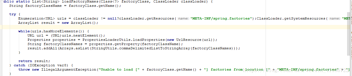 查看AutoConfigurationImportSelector类的方法,调用了loadFactoryNames方法去读取我们jar包中的META-INF/spring.factories文件.