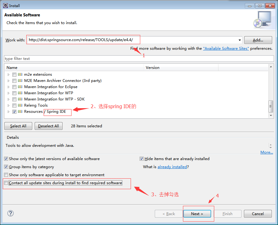 3、Help→Install New Software,在Work with中输入http://dist.springsource.com/release/TOOLS/update/e4.4/,回车等待片刻。