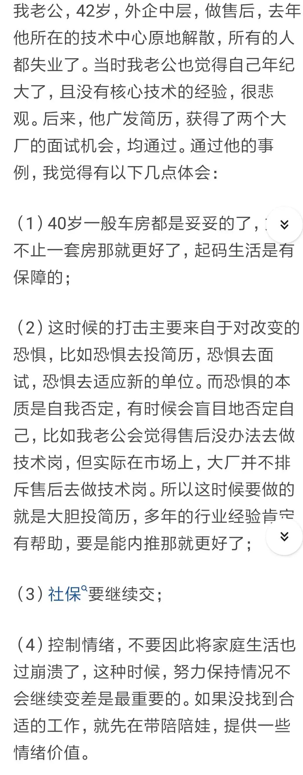 还有一位网友讲述了自己老公的案例:42岁的外企中层,去年所在的技术中心原地解散,所有人都失业了。起初该网友老公也觉得自己年纪很大,且没有核心技术经验,很悲观。但后来他广发简历,获得了两个大厂的面试机会,均通过。