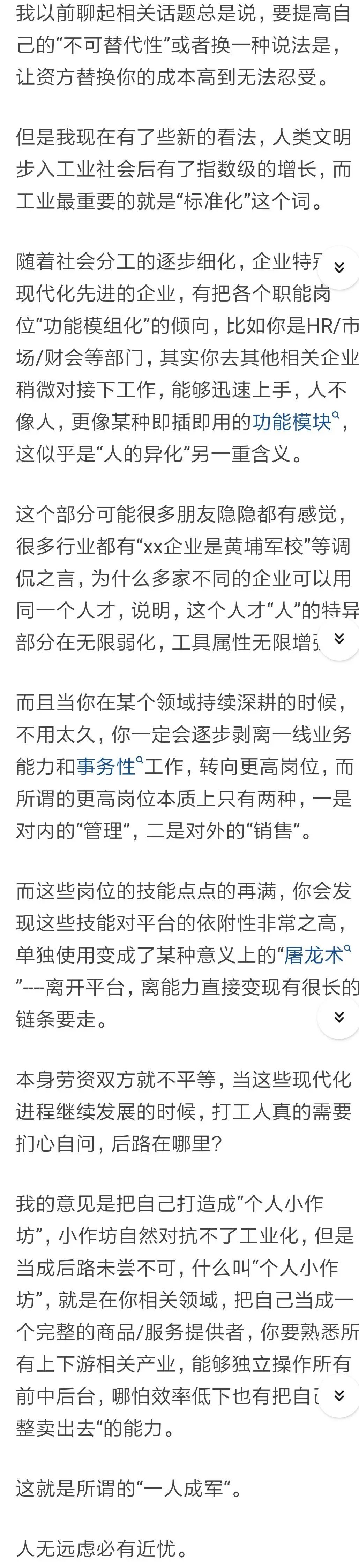 有人说,以前会觉得要提高自己的"不可替代性",但现在有了新的看法。随着社会分工逐步细化,企业的职能岗位逐渐“功能模块化”,人不像人,更像是一种即插即用的功能模块。人的特异部分被无限弱化,工具化属性在增强。