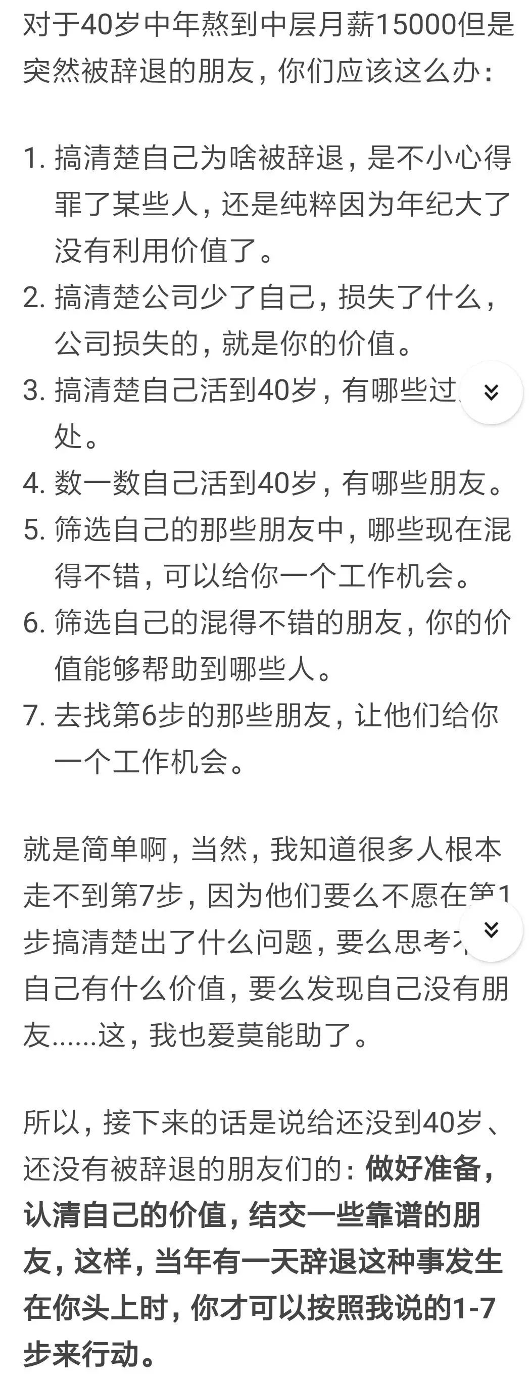 最后,所有人都应该做好准备,认清自己的价值,结交一些靠谱的朋友,这样才能在中年被辞退时,按照上述1-7步来走。