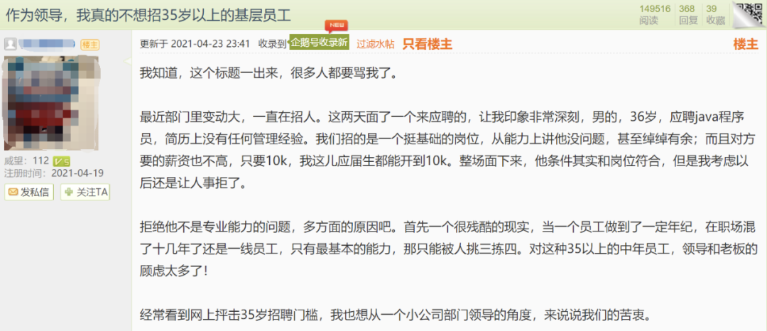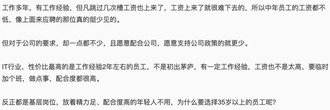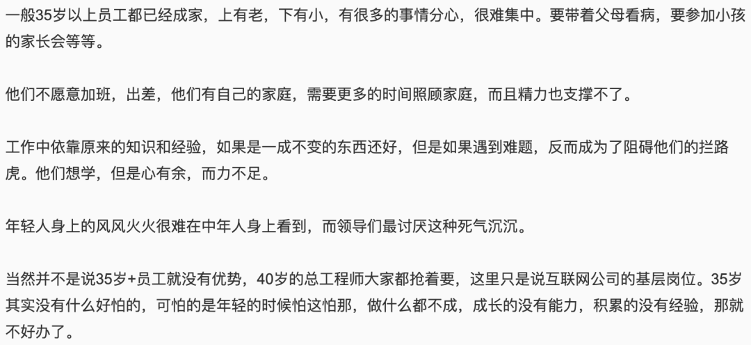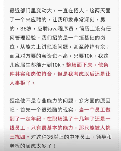 转述的简讯不完整,为了不错误的批评“原简讯的那个部门领导”,我找到了原贴:《作为领导,我真的不想招 35 岁以上的基层员工[1]》。