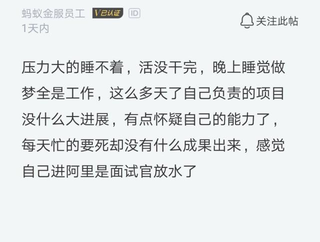 这里就有一位阿里的程序员最近压力山大,他表示自己压力大的睡不着,活没干完,晚上睡觉做梦全是工作,这么多天了自己负责的项目没什么大进展,有点怀疑自己的能力,每天忙得要死却没有什么成果出来,感觉自己进阿里是面试官放水了。