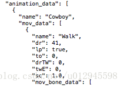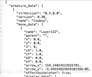 笔者截了一个Json文件的开头部分,可以看到数据里面有一项 “name”对应的值是“Cowboy”,这个Cowboy便是我们需要的文件名,在代码中的CCArmature::Create()部分。